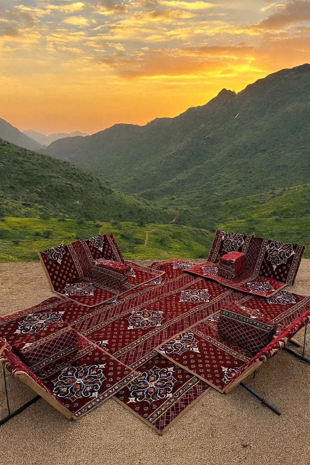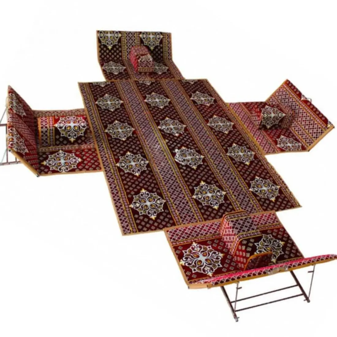 تشمل الجلسة فرشة أرضية واسعة بمقاس 2×3 متر مصنوعة من قماش تركي متين وسماكة عالية لتوفير أقصى درجات الراحة، مع قماش خارجي من اللباد بسماكة 2 ملم يسهل تنظيفه من الأتربة والأوساخ.