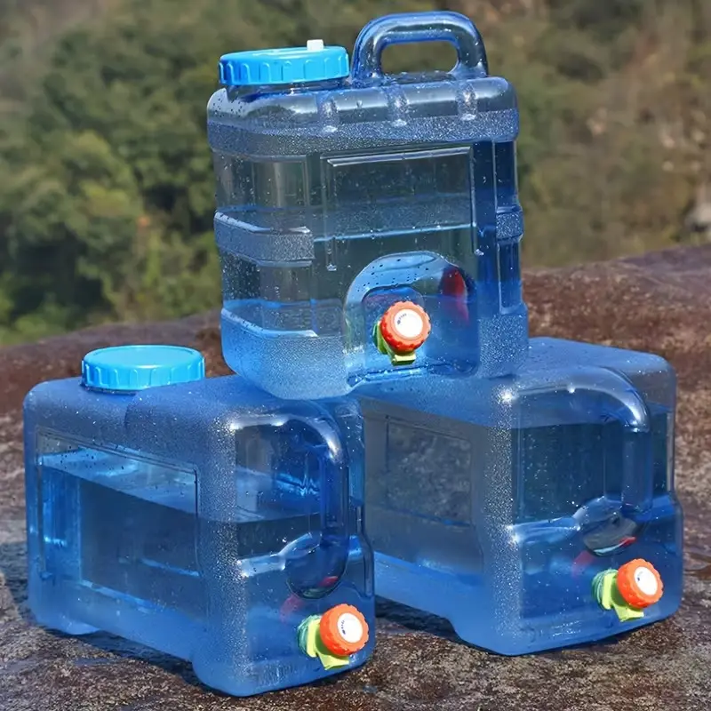 جركل ماء شفاف باللون الأزرق بسعة 20 لتر، مصمم لتخزين مياه الشرب للاستخدام الخارجي والعائلي. يتميز بسهولة الاستخدام مع فوهة واسعة بقطر 10 سم لتسهيل التعبئة والتنظيف.
