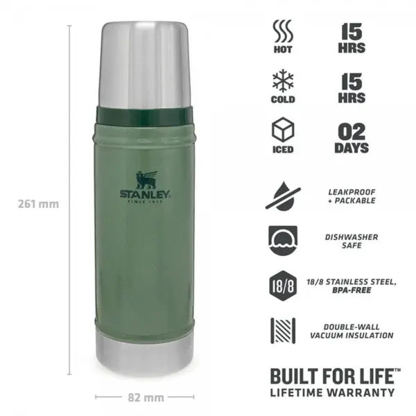 تمتع بمشروبك في أي وقت وأي مكان مع زجاجة ستانلي كلاسيك ليجندري 470 مل. مصممة بجودة عالية من فولاذ مقاوم للصدأ 18/8، وبعزل فراغي مزدوج الجدار لحفظ الحرارة والبرودة حتى 15 ساعة، والمشروبات المثلجة حتى يومين!
