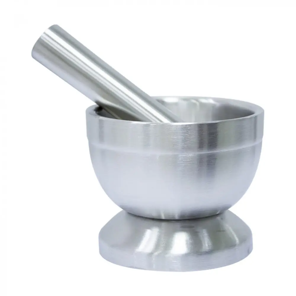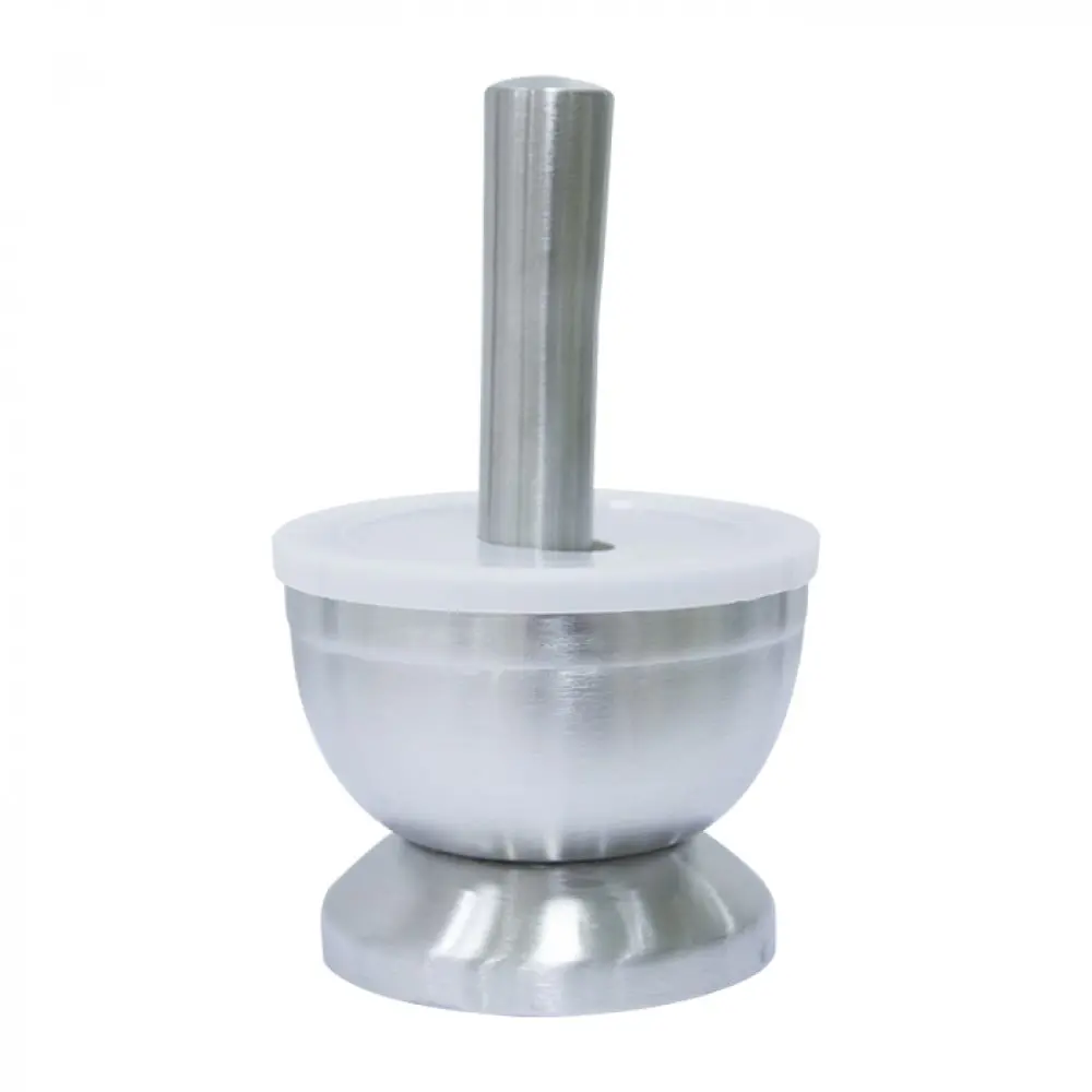 هاون بغطاء – مصنوع من الستانلس ستيل عالي الجودة، مصمم لطحن التوابل والأعشاب بكفاءة وسهولة. يأتي مع غطاء بلاستيكي للحفاظ على النظافة وتقليل الفوضى أثناء الاستخدام.