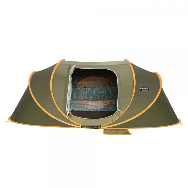 تأتي الخيمة بلون زيتي أنيق وأبعاد 200×300×110 سم، مع تصميم عملي يحتوي على مساحة مخصصة للأحذية والملابس والمستلزمات لضمان تنظيم مثالي داخل الخيمة.