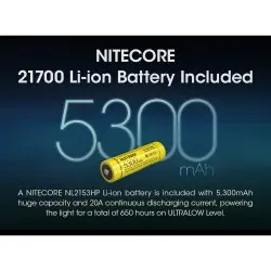 مزود ببطارية 21700 قابلة للشحن لتوفير مدة تشغيل طويلة تصل إلى 650 ساعة، مع وضعية وميض خاصة للطوارئ.