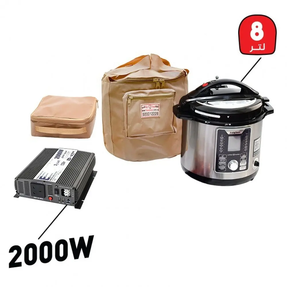 مجموعة القدر والمحول 8 لتر هي الحل الذكي والمثالي لكل من يعشق السفر والتخييم ويريد طبخ كبسة لذيذة في أي مكان بسهولة ودون الحاجة لسيارة مجهزة أو بطارية إضافية. فقط قم بفصل شنطة القدر وشنطة المحول، وصلهم ببعض، وشبك الاشتراك في بطارية سيارتك مهما كان نوعها، حتى لو كانت هونداي اكسنت!