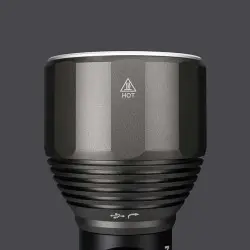 يعمل الكشاف ببطارية ليثيوم 26650 بسعة 5000 ملي أمبير قابلة لإعادة الشحن عبر منفذ تايب سي 5V/2A، حيث يتم الشحن الكامل خلال 4 ساعات فقط، ويُستخدم أيضًا كمخزن طاقة (Power Bank) لشحن الأجهزة الأخرى عند الحاجة.