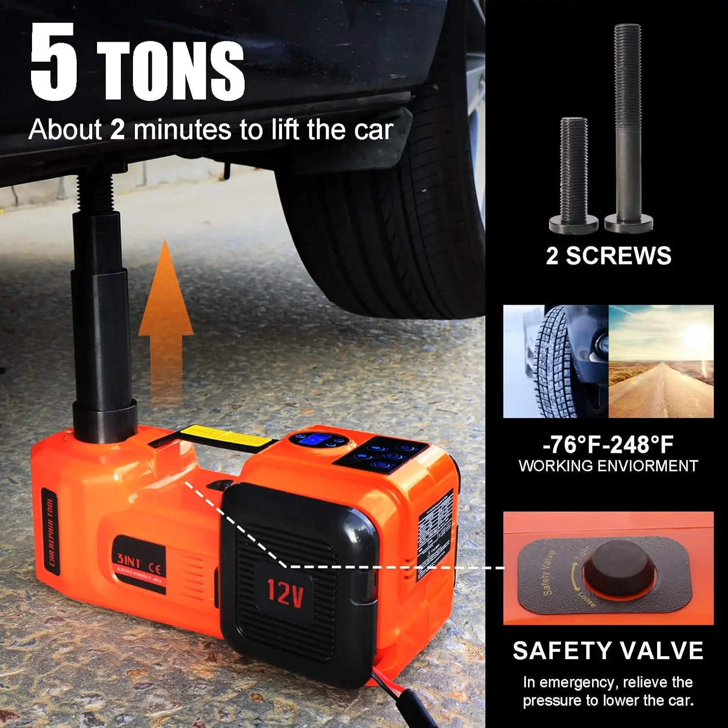 مقبس سيارة هيدروليكي كهربائي مصمم لتوفير أقصى قوة وثبات عند رفع السيارات. يعمل على جهد DC 12V بقدرة 180 واط، ويستطيع رفع وزن يصل إلى 5 طن بكل أمان.