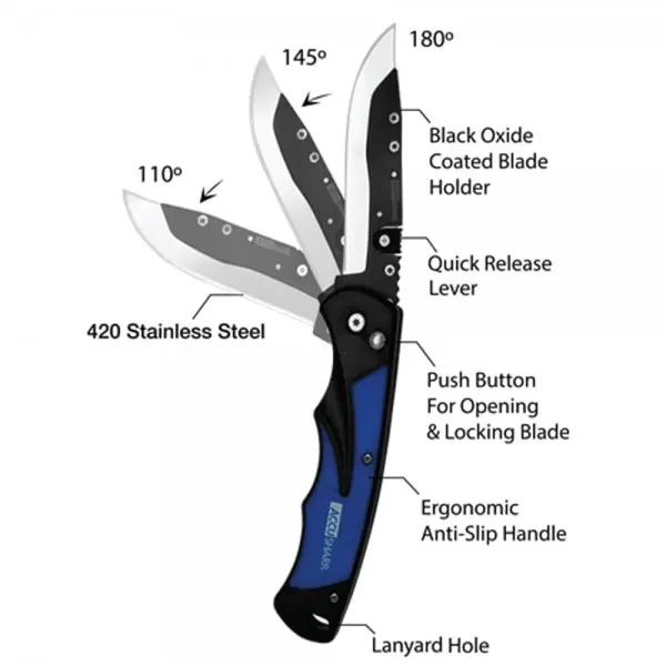 السكين مزود بوضعيات متعددة للنصل بزاوية 110°، 145°، و180°، مما يجعله مناسبًا لمجموعة واسعة من مهام القطع.