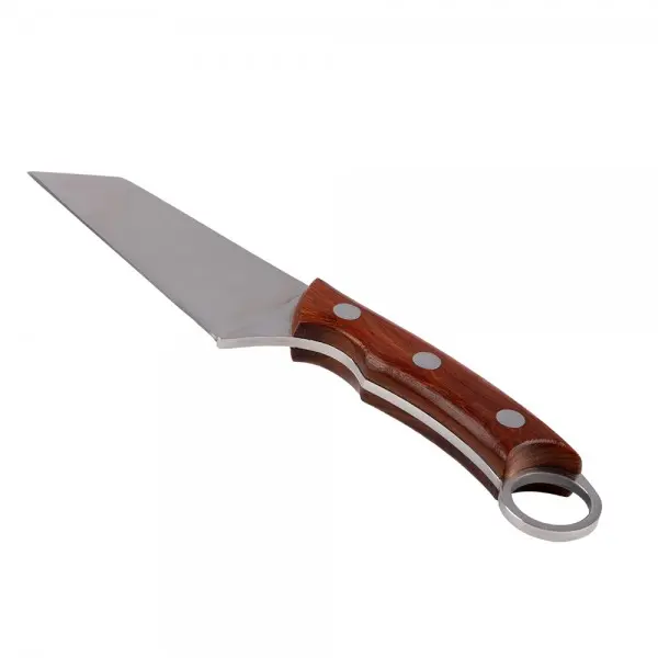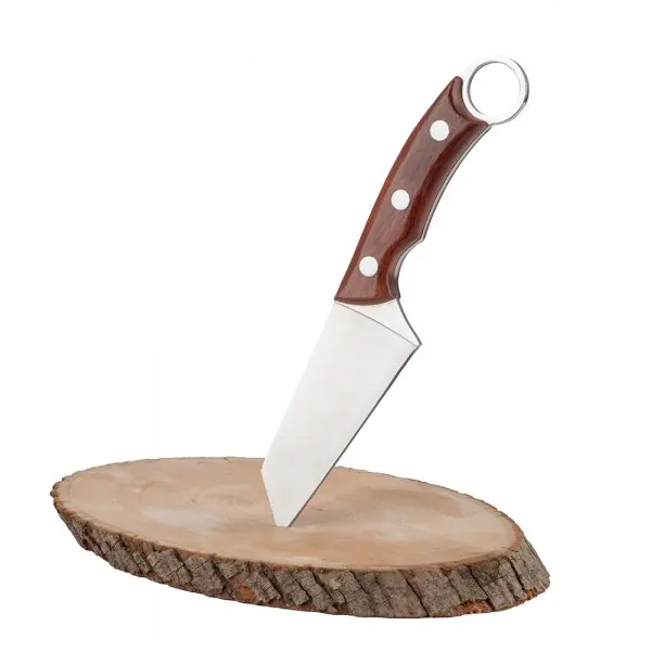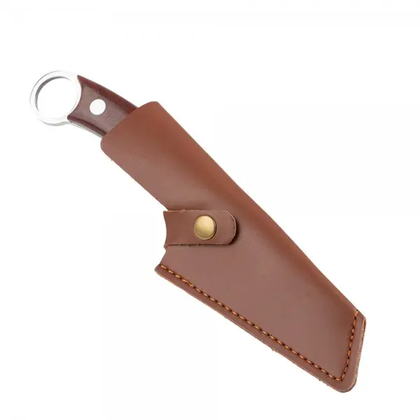يتميز المقبض الخشبي بلونه البني الأنيق الذي يوفر قبضة مريحة ومتانة عالية. يأتي السكين مع جراب متين بأبعاد 15×27 سم لحفظه بأمان أثناء التنقل.