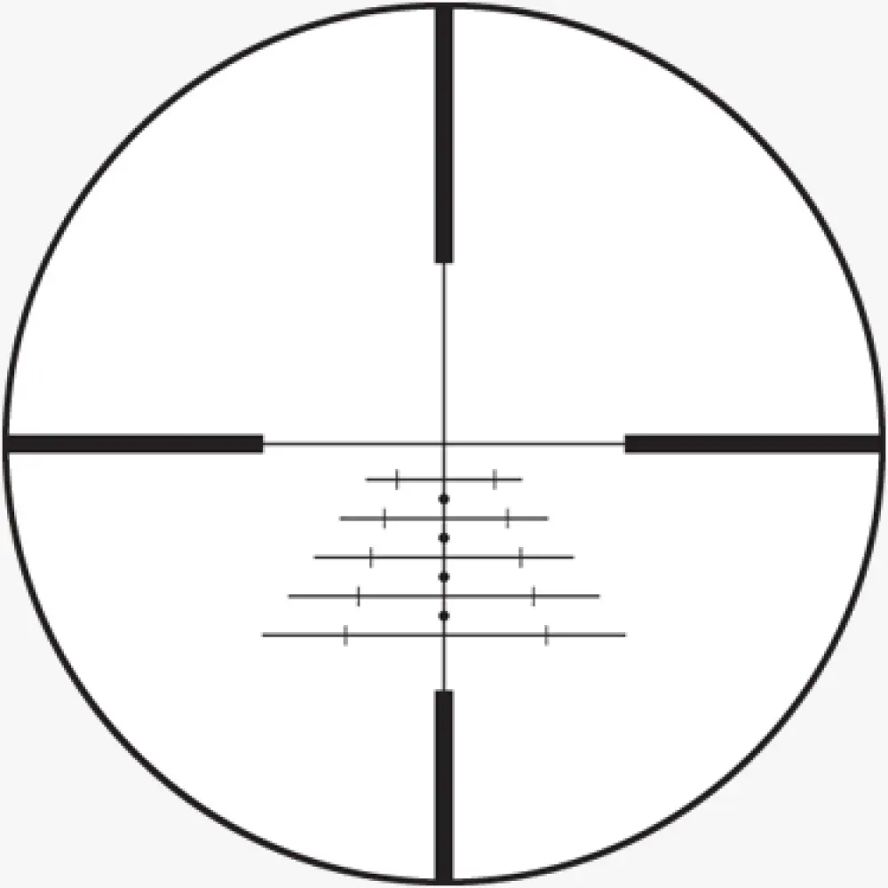 BRS (Ballistic Reticle System): شبكة/تدرّج باليستي مصمّم لتبسيط تعويض الانخفاض والرياح دون الحاجة لحسابات معقدة.