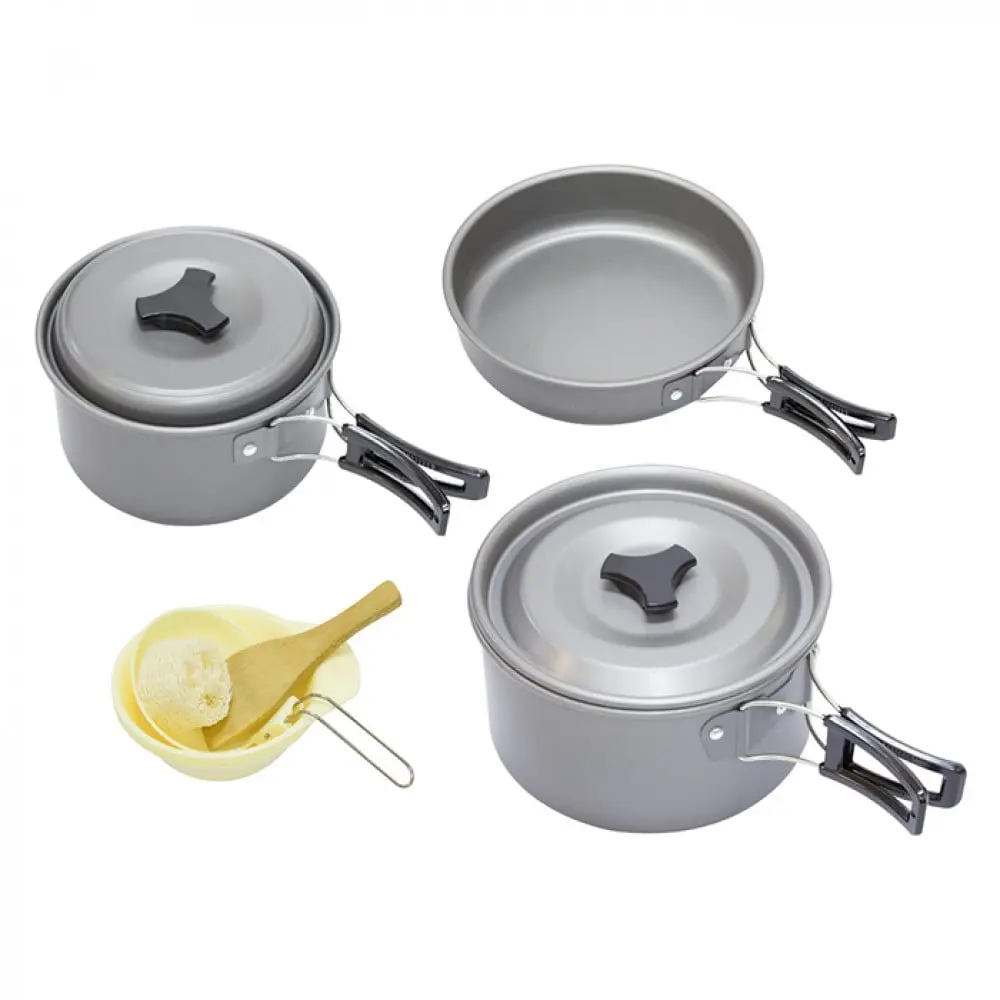 طقم قدور المسافر – طقم متكامل مكون من قدرين، مقلاة، وأدوات طبخ تُدخل بعضها داخل بعض لتوفير المساحة، يأتي مع شنطة عملية للحفظ والنقل. مصنوع من الألمنيوم خفيف الوزن، مثالي للرحلات والتخييم.