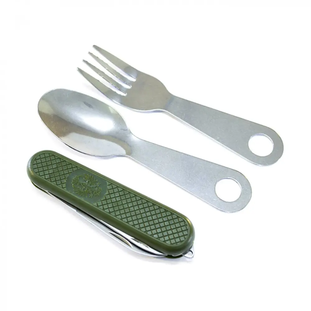 طقم أدوات طعام للرحلات – طقم مكون من سكين، شوكة، ملعقة، مع جراب مخصص للحفظ. مصنوع من الستانلس ستيل المقاوم للصدأ، يمكن طيّ الأدوات ووضعها داخل الجراب لتوفير المساحة. مثالي للتخييم، الرحلات، أو حتى للاستخدام اليومي خارج المنزل.